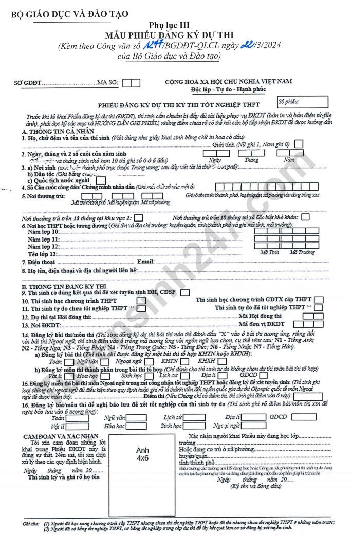 Mẫu phiếu đăng ký dự thi tốt nghiệp THPT năm 2024