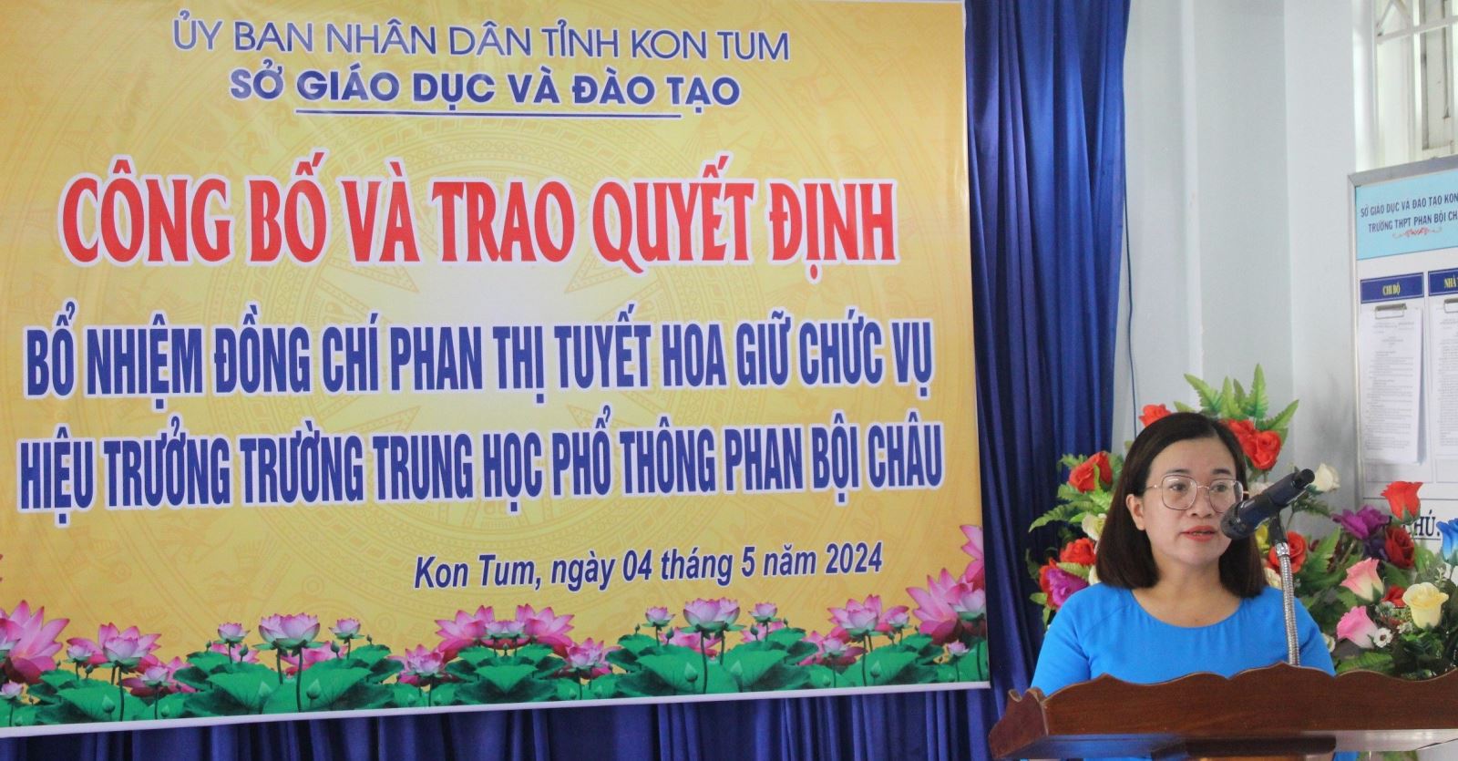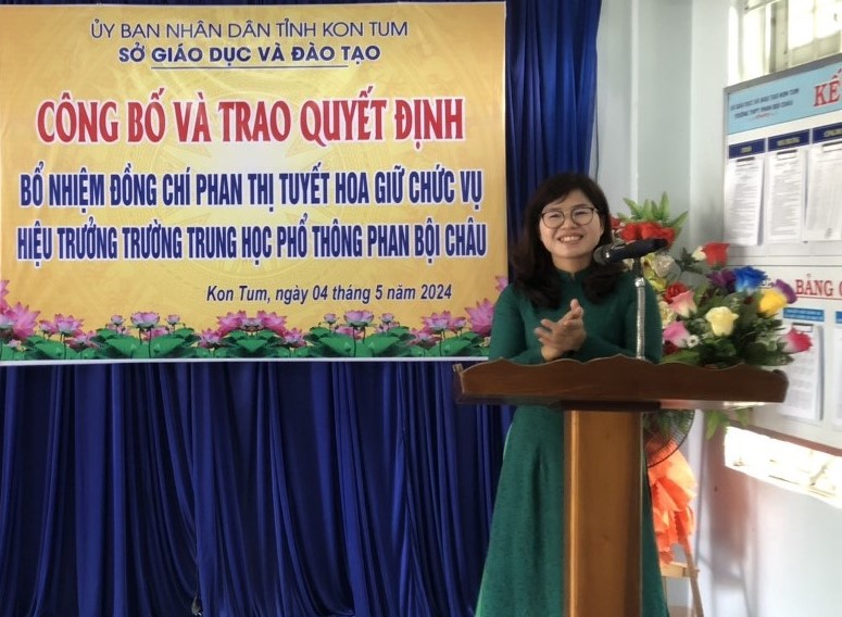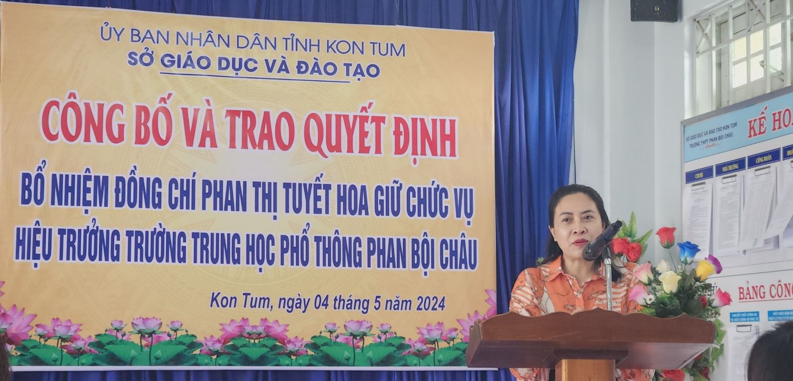 Thay mặt tập thể Trường THPT Phan Bội Châu, Cô Phan Thị Tuyết Hoa - Hiệu trưởng nhà trường gửi lời chúc sức khỏe, hạnh phúc và thành công đến các đồng chí lãnh đạo, quý vị đại biểu, quý bậc phụ huynh, quý thầy giáo, cô giáo, cán bộ nhân viên nhà trường; Đồng thời, đồng chí tân Hiệu trưởng cũng gửi lời cảm ơn đến Chính quyền địa phương đã luôn đồng hành, phối hợp với nhà trường trong công tác quản lý, giáo dục học sinh, nâng cao chất lượng dạy và học trên địa bàn. Bên cạnh niềm vinh dự, tự hào của cá nhân và gia đình. Cô Phan Thị Tuyết Hoa - Hiệu trưởng nhà trường xin hứa sẽ luôn nỗ lực, cố gắng hết sức, phát huy tinh thần trách nhiệm, năng lực của mình; nghiên cứu, học hỏi, tiếp cận các nội dung công việc trên cương vị mới; cùng tập thể Nhà trường đoàn kết, thống nhất, hoàn thành tốt các nhiệm vụ được giao; quyết tâm giữ vững và phát huy hơn nữa những giá trị truyền thống của Trường THPT Phan Bội Châu đã đạt được trong những năm qua.