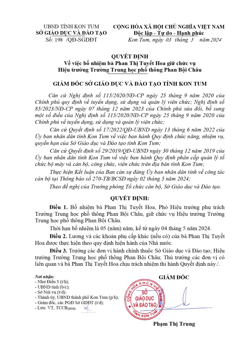 Sáng ngày 04/5/2024 tại Trường THPT Phan Bội Châu tổ chức Công bố Quyết định số 198/QĐ-SGDĐT, ngày 03/5/2024 về việc bổ nhiệm Hiệu trưởng Trường THPT Phan Bội Châu;