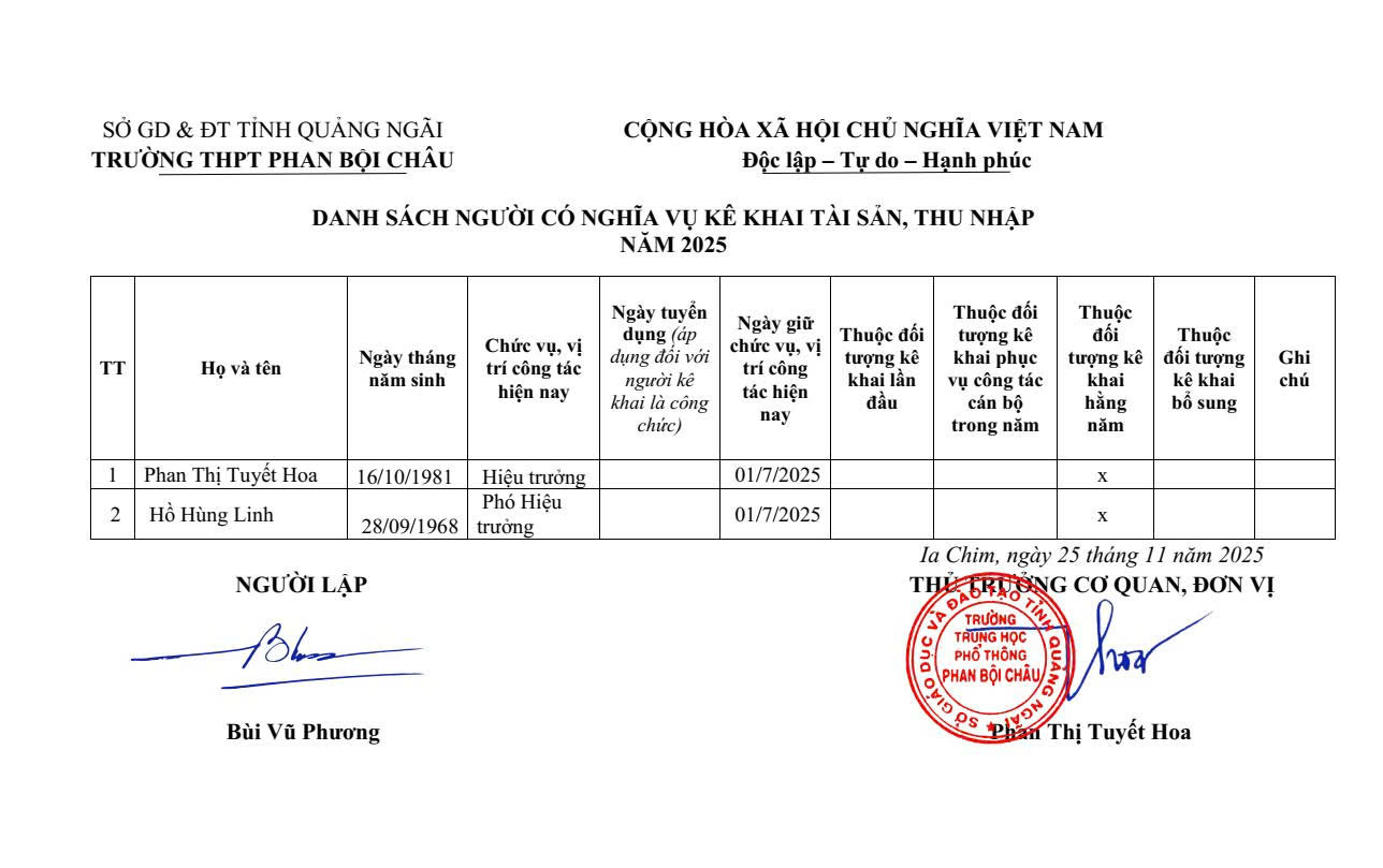 Trường THPT Phan Bội Châu thông tin danh sách người có nghĩa vụ thực hiện kê khai tài sản, thu nhập năm 2025; Người có nghĩa vụ KKTSTN phải thực hiện kê khai trong vòng 10 ngày kể từ ngày có Quyết định phê duyệt danh sách người có nghĩa vụ KKTSTN năm 2025;