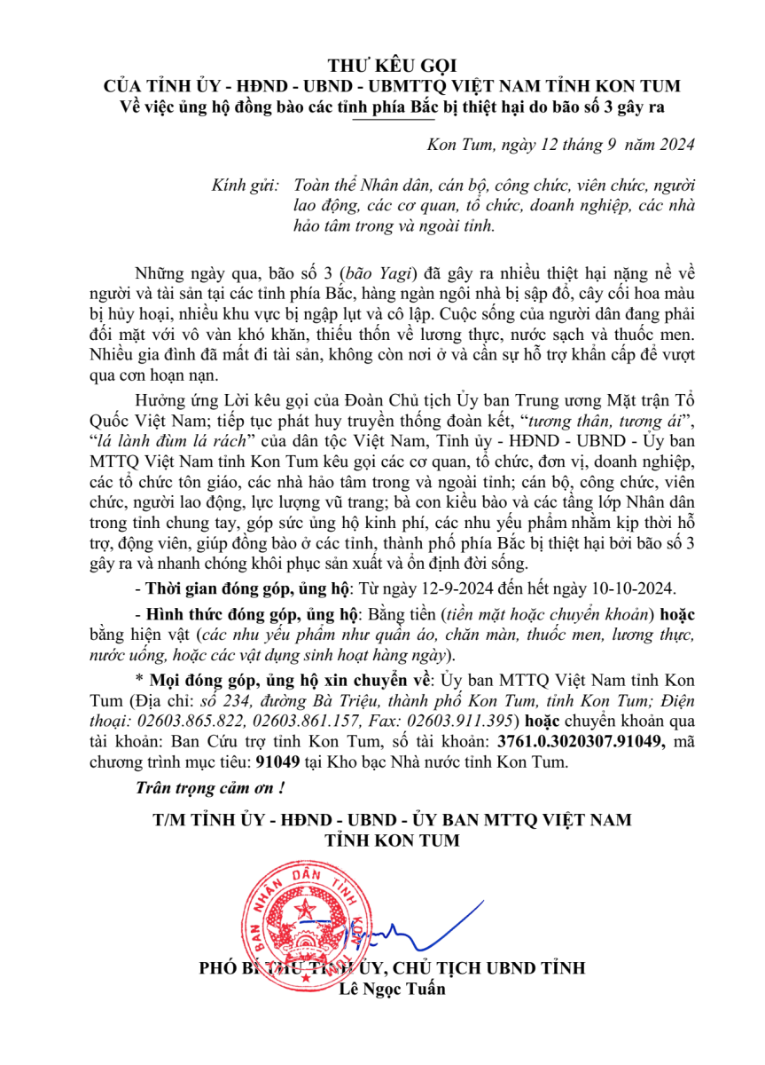 Hưởng ứng Thư kêu gọi của Tỉnh uỷ - HĐND - UBND - UBMTTQ Việt Nam tỉnh Kon Tum về việc ủng hộ đồng bào các tỉnh phía Bắc bị thiệt hại do bão số 3 gây ra.